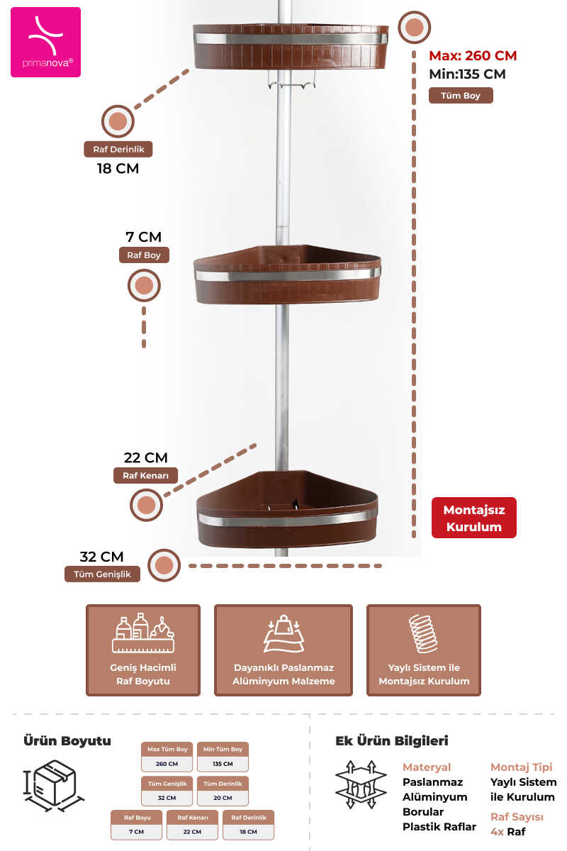 Primanova Banyo Köşe Seti Fina Beyaz Yer ile tavan arasına sıkıştırlarak kurulur 260 cm e kadar tavan yüksekliğine uygulanabilir Montaj için vida ve delik gerektirmez Paslanmayan alüminyum borular Her rafa takılabilen 2 askı Şampuan şişelerini ters konumda tutabileceğiniz raf delikleri El yapımı ahşap görünüm Ekstra büyük raflar Banyo malzemelerini ve traş bıçağı için büyük askı