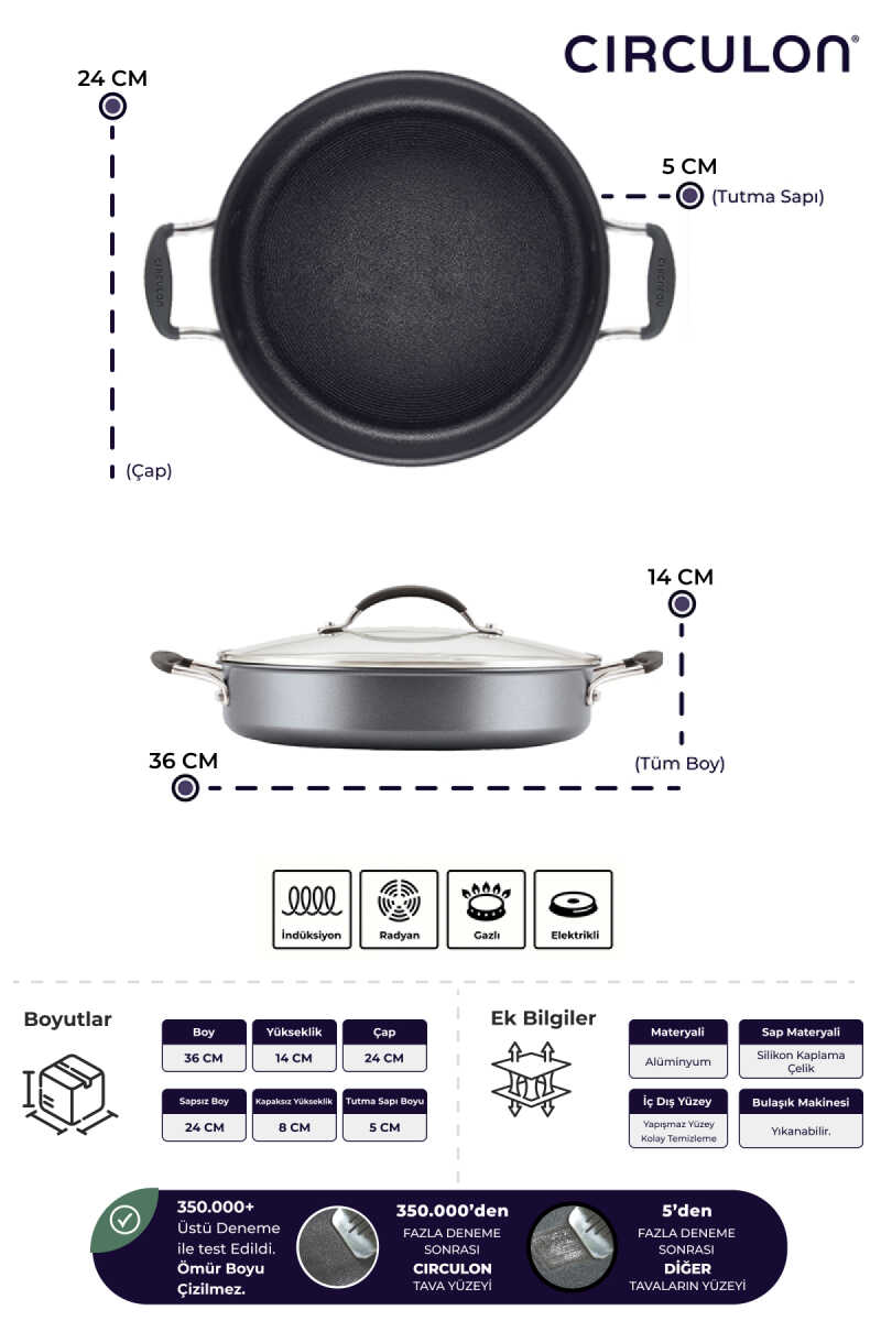 Alüminyum gövde üzerine uygulanmış ScratchDefense kaplama malzemesi, hızlı ve her noktaya eşit ısı dağılımı sağlerken; kalın ve indüksiyona uygun paslanmaz çelik tabanı, dayanıklılığını ve ısı transferini arttırıyor.