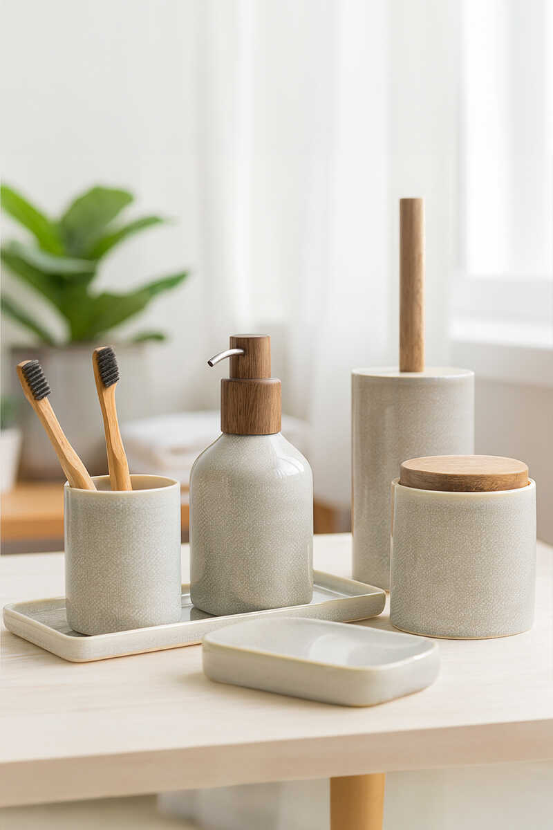 Seramik malzemeden üretilen Elegance Banyo Seti, 6 Parça içeriği ile banyonuza düzen, zariflik ve şıklık katar.