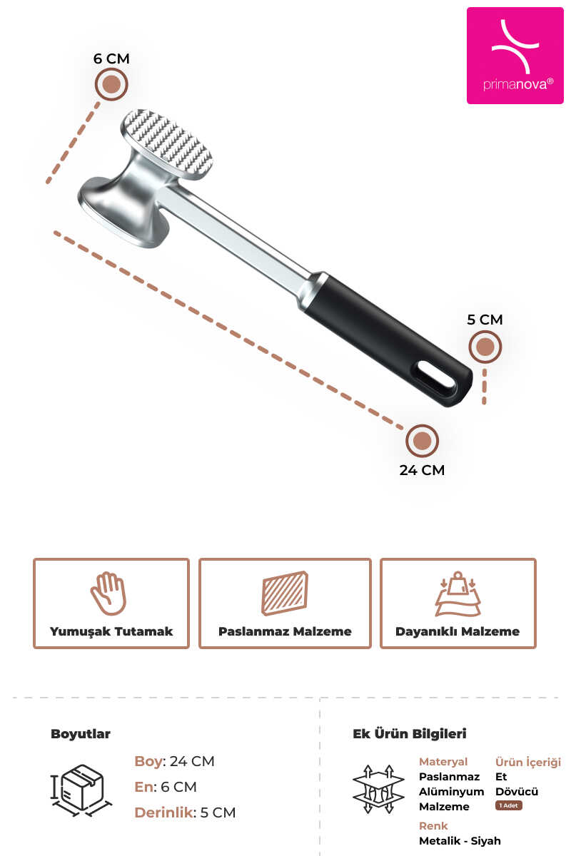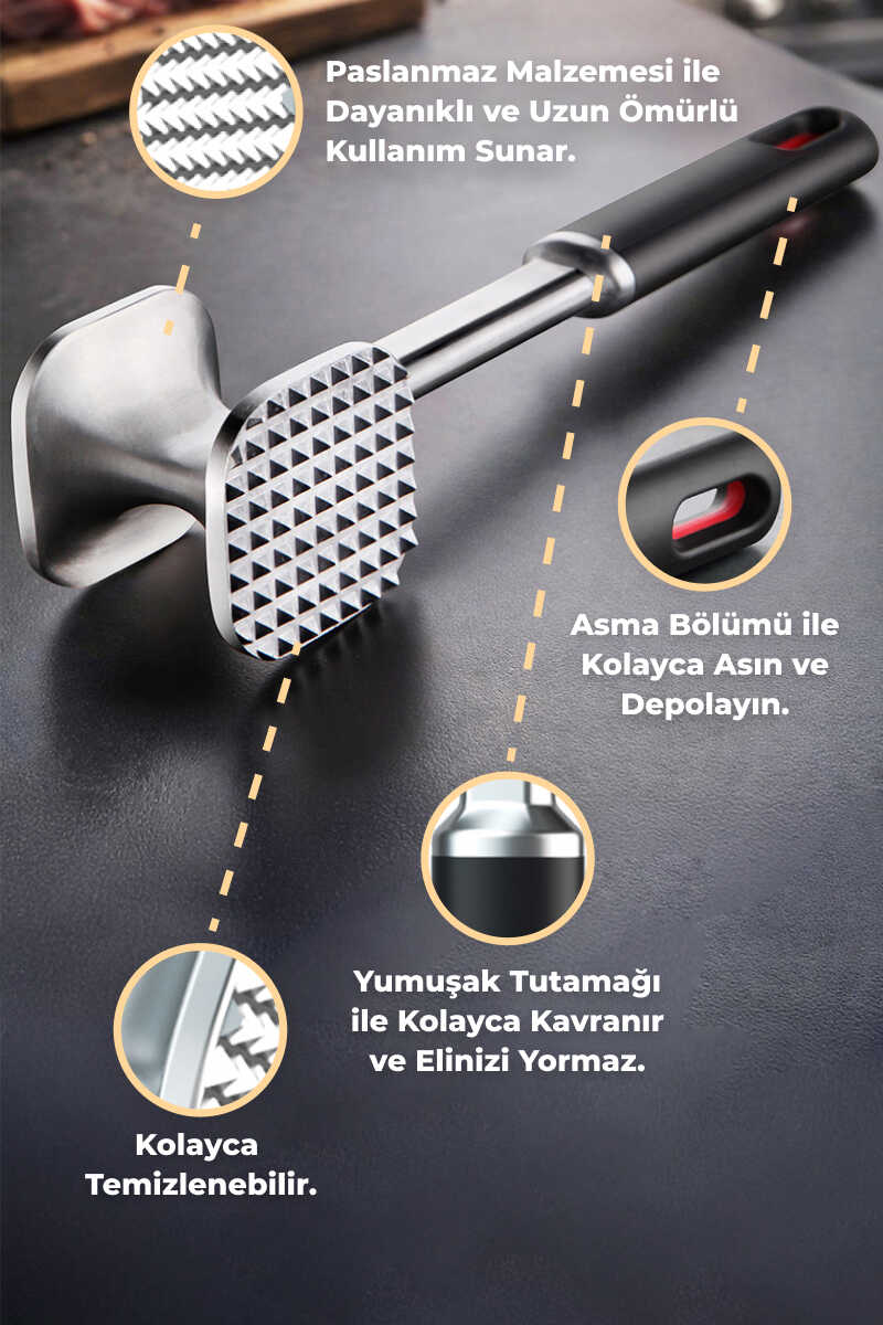 Paslanmaz yapıya sahip et dövücü, dayanıklı ve uzun ömürlü kullanım sunar. Yumuşak tutamağı sayesinde kolay kavranır ve eli yormaz.