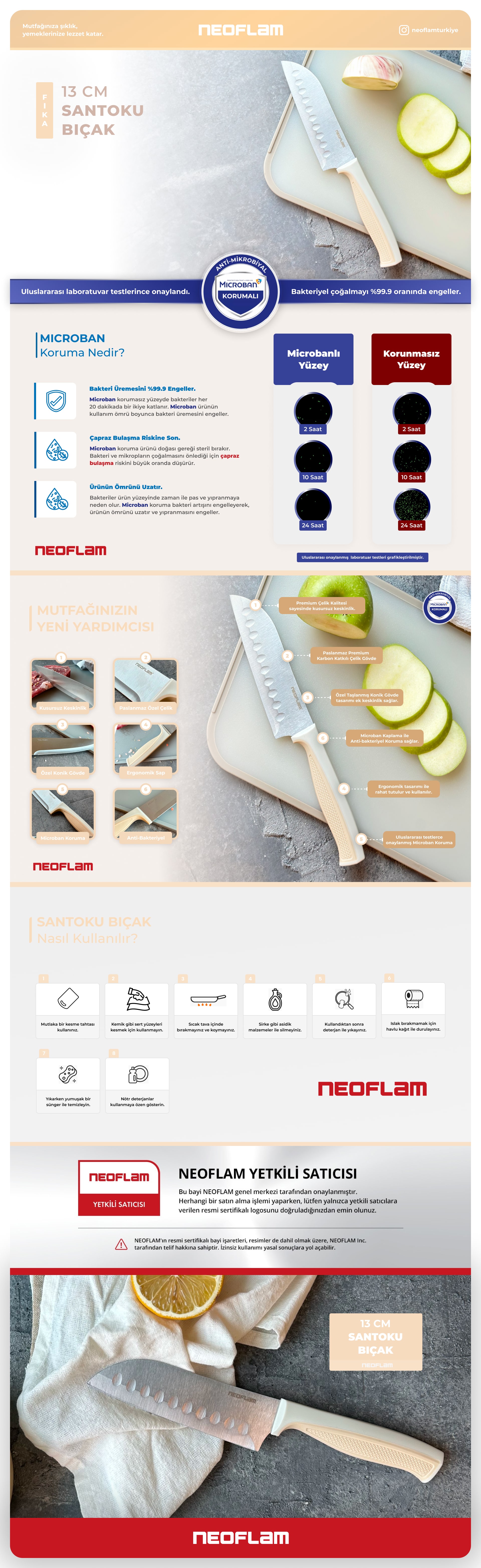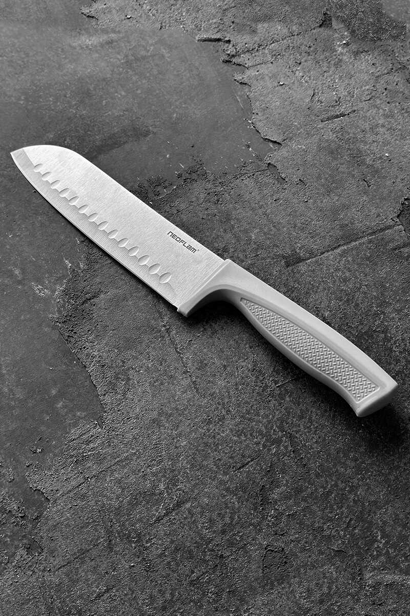 Neoflam Fika microban santoku bıçak 13 CM gri Yüksek karbon katkılı paslanmaz çelik bıçak. -Antibakteriyel özellikli microban sap. -Sap kısmındaki destek tasarımı kavrama kolaylığı sağlar. Böylece güvenli kullanım ve mükemmel bir denge sağlanır. -Bıçak gövdesinin konik formda taşlanmış olması kesme ve doğrama esnasında sağlamlık ve uzun süreli keskinlik sağlar. KULLANIM & BAKIM -Bulaşık makinesinde yıkanabilir ancak uzun ömürlü kullanım için elde yıkama tavsiye edilir. -Kullanırken kesme tahtası kullanınız. -Kemikli gıdaların doğranmasında kullanmayınız. -Donmuş gıdaların doğranmasında kullanmayınız. -Bıçağı temizlemek için kullanılan sert- aşındırıcı maddeler bıçak üzerinde kalıcı çizikler bırakabilir.;