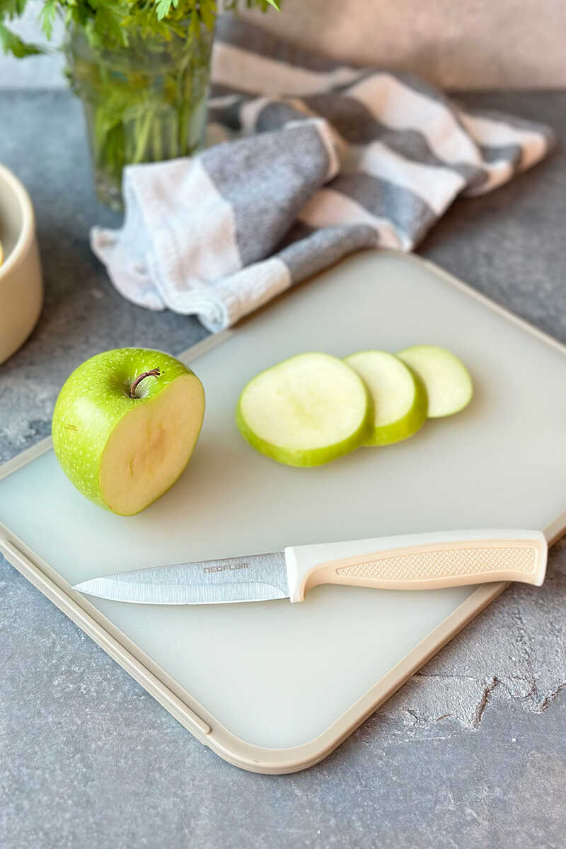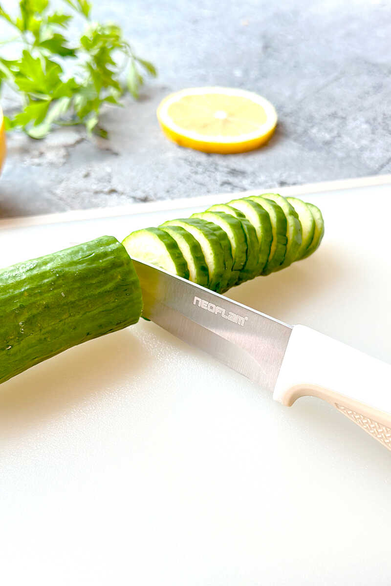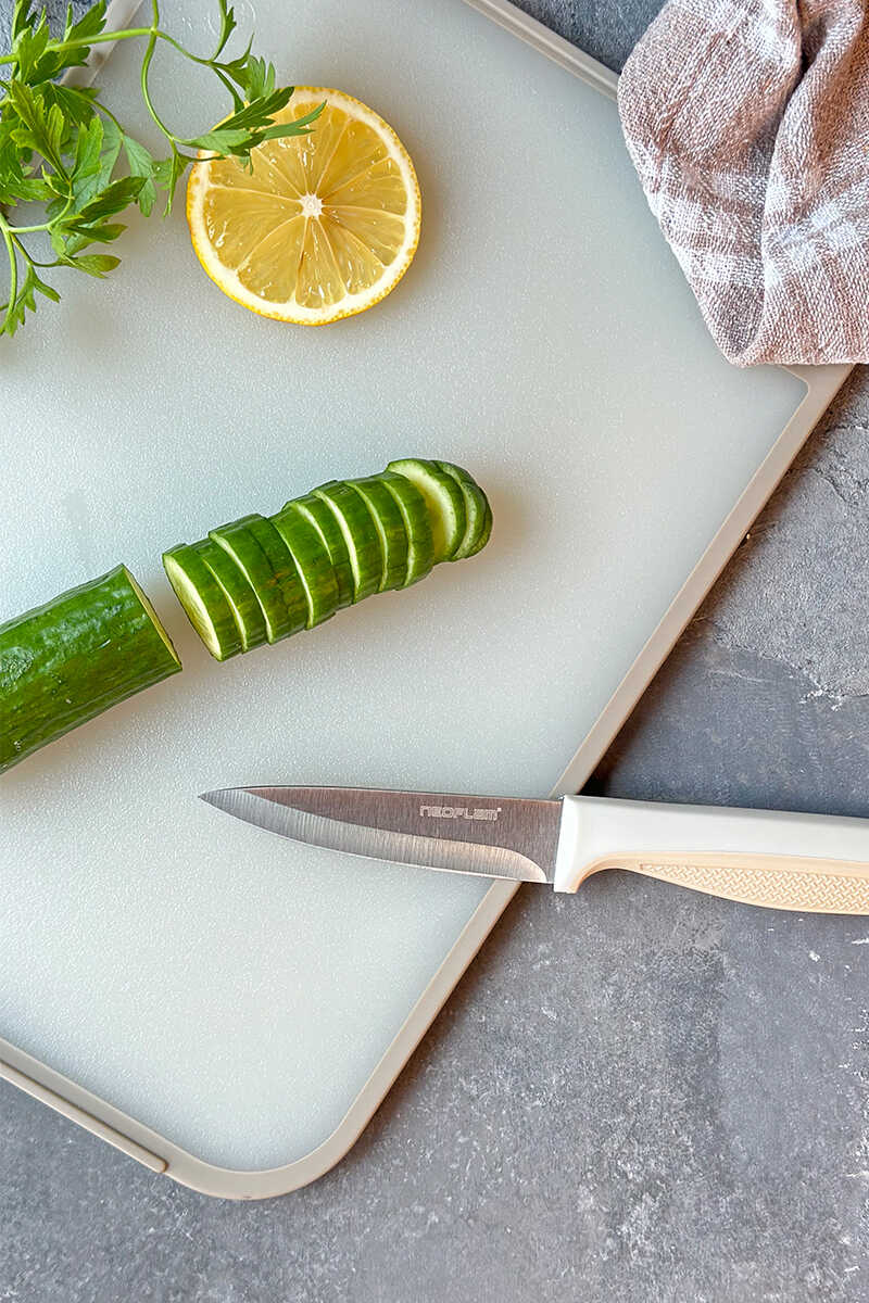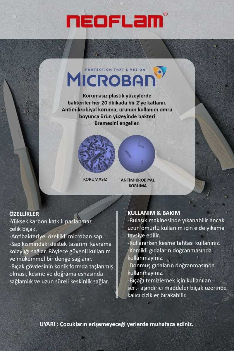 Neoflam Fika microban soyma bıçak 8 CM bej Yüksek karbon katkılı paslanmaz çelik bıçak. -Antibakteriyel özellikli microban sap. -Sap kısmındaki destek tasarımı kavrama kolaylığı sağlar. Böylece güvenli kullanım ve mükemmel bir denge sağlanır. -Bıçak gövdesinin konik formda taşlanmış olması kesme ve doğrama esnasında sağlamlık ve uzun süreli keskinlik sağlar. KULLANIM & BAKIM -Bulaşık makinesinde yıkanabilir ancak uzun ömürlü kullanım için elde yıkama tavsiye edilir. -Kullanırken kesme tahtası kullanınız. -Kemikli gıdaların doğranmasında kullanmayınız. -Donmuş gıdaların doğranmasında kullanmayınız. -Bıçağı temizlemek için kullanılan sert- aşındırıcı maddeler bıçak üzerinde kalıcı çizikler bırakabilir.;