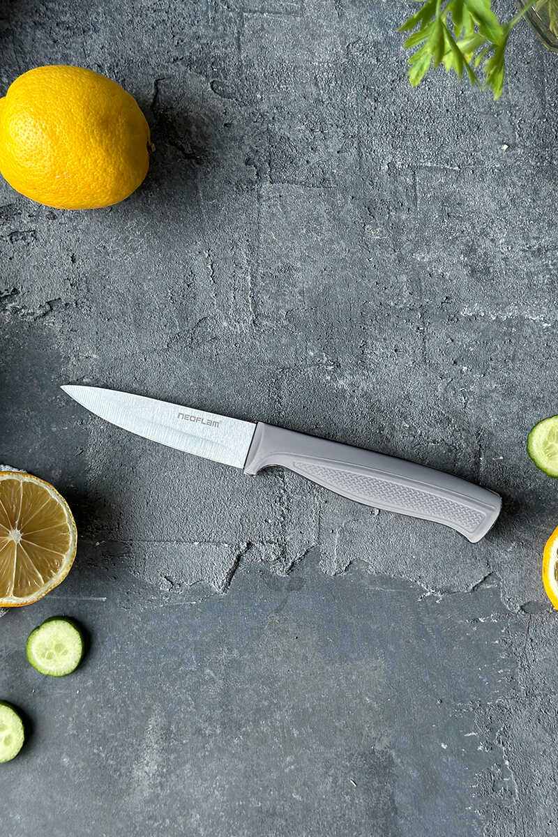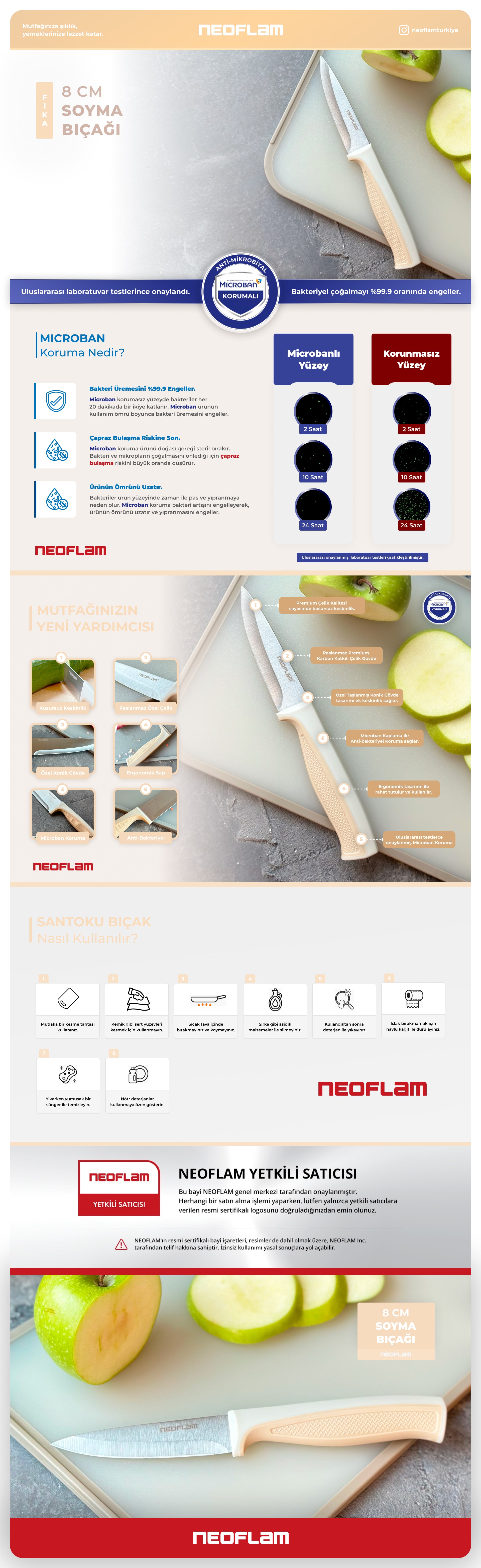 Fika mikroban soyma bıçağı 8 CM gri Yüksek karbon katkılı paslanmaz çelik bıçak. -Antibakteriyel özellikli microban sap. -Sap kısmındaki destek tasarımı kavrama kolaylığı sağlar. Böylece güvenli kullanım ve mükemmel bir denge sağlanır. -Bıçak gövdesinin konik formda taşlanmış olması kesme ve doğrama esnasında sağlamlık ve uzun süreli keskinlik sağlar. KULLANIM & BAKIM -Bulaşık makinesinde yıkanabilir ancak uzun ömürlü kullanım için elde yıkama tavsiye edilir. -Kullanırken kesme tahtası kullanınız. -Kemikli gıdaların doğranmasında kullanmayınız. -Donmuş gıdaların doğranmasında kullanmayınız. -Bıçağı temizlemek için kullanılan sert- aşındırıcı maddeler bıçak üzerinde kalıcı çizikler bırakabilir.