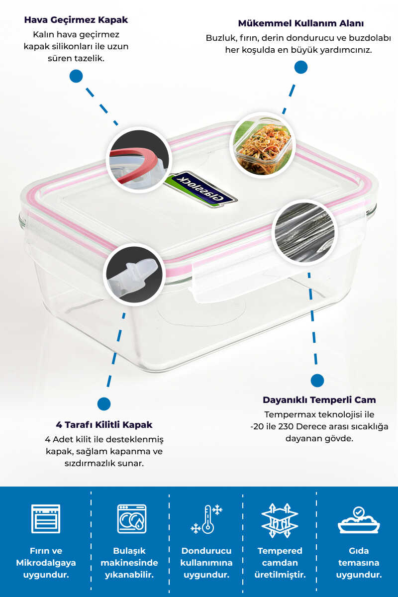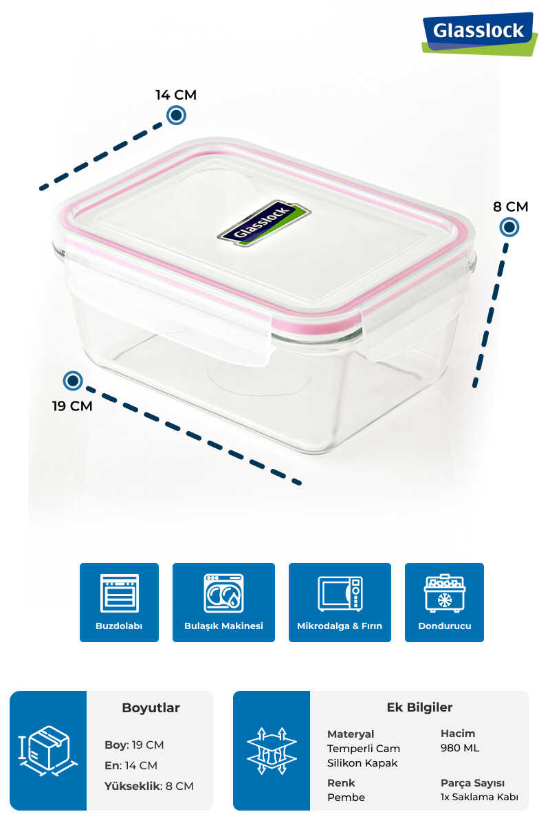 Glasslock Konik Dikdörtgen Cam Saklama Kabı 980 Ml* Ürün Ölçüleri: 185 X 139 X 76 mm.* Ürün Ağırlığı: 660 Gr.* PP Kapak* Silikon Civata* Kompakt Tasarım* Derin dondurucuda kullanılabilir.* Bulaşık Makinesinde yıkanabilir.* Mikrodalga Fırında Kullanılabilir.* Dayanıklı Temperli Cam. (-20°C'de 230°C'ye kadar ısıya dayanıklıdır.)* Toksit İçermez.* Tüm Glasslock ürünleri CO2 emisyonunu azaltmak için soda külünden yapılmış doğa dostu ürünlerdir.