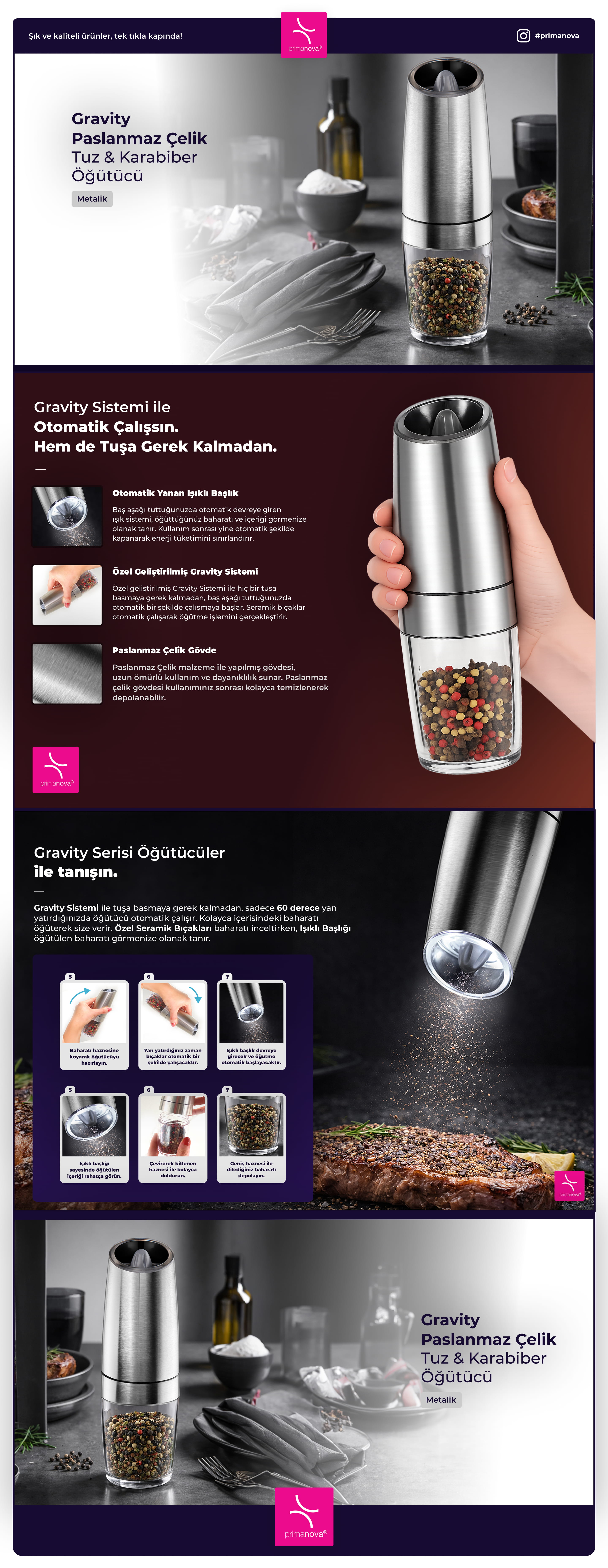 Paslanmaz çelik malzeme ile tasarlanmış Gravity serisi öğütücümüz; Seramik bıçakları ile sofra ve yemeklerinize kolaylık katmak için geliştirildi.