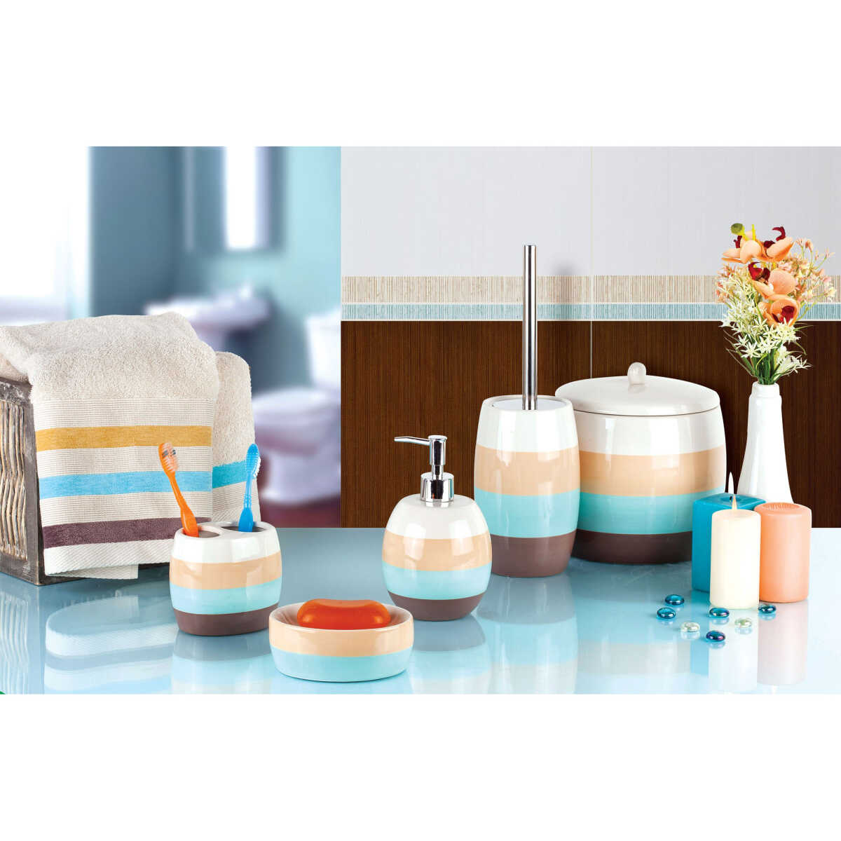 Primanova Katy Banyo Seti 5 parçadan oluşup set içerisinde sıvı sabunluk sabunluk diş fırçalık tuvalet fırçası ve kapaklı kova bulunmaktadır. Ürün Seramik malzemeden üretilmiş olup el boyamasıdır