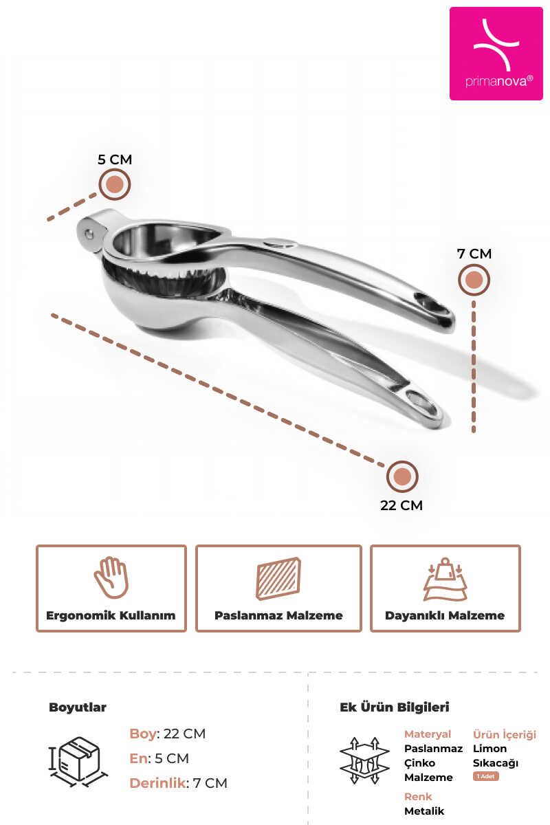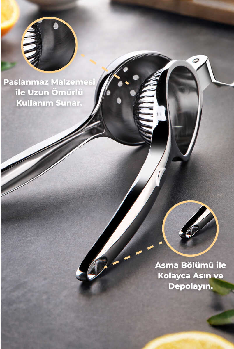 Paslanmaz yapıya sahip Limon Sıkacağı, dayanıklı ve uzun ömürlü kullanım sunar. Ergonomik tutamakları sayesinde kolay kavranır ve eli yormaz.