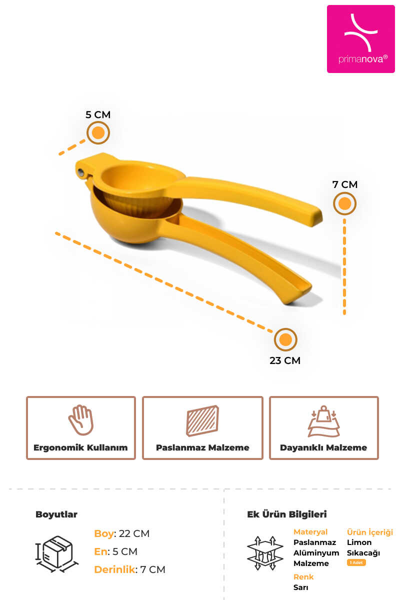 Paslanmaz yapıya sahip Limon Sıkacağı, dayanıklı ve uzun ömürlü kullanım sunar. Ergonomik tutamakları sayesinde kolay kavranır ve eli yormaz.