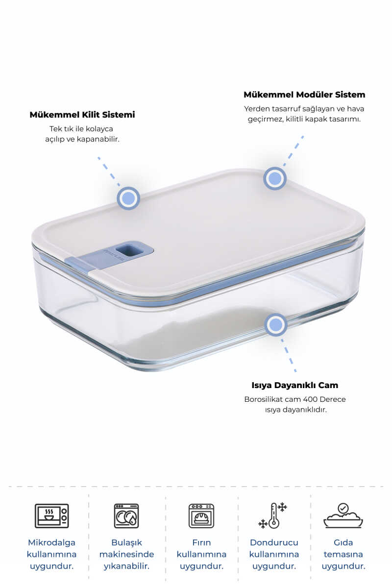 Neoflam Perfect Seal dikdörtgen cam saklama kabı, mükemmel tasarımı ve 400 derece ısıya dayanıklı borosilikat cam gövdesi ile yiyeceklerinizi uzun süre ilk günkü tazeliğinde korur. Omada lisanslı Perfect Lever kilidi sayesinde tek eliniz ile kapağı açıp, kapatabilirsiniz. Mükemmel hava mührü ve koruması sağlayan tasarımı ile buzdolabından, derin dondurucuya kadar saklama imkanı sunarken, borosilikat malzemesinden üretilen gövdesi ile normal fırın ve mikrodalgada yiyeceklerinizi ısıtma imkanı sunar. Yiyeceklerinizin tazeliğini, kolayca kapanıp açılabilen kilit sistemi ile uzun süre korurken, yerden tasarruf sağlayan modüler tasarımı ile size alan kazandırır. Özellikler: -Kapak hariç tüm ürün, tamamen camdan üretilmiştir. -Borosilikat cam malzeme, 400 derece ısıya kadar dayanıklıdır. -Bulaşık makinasında yıkamak isterseniz üst rafı tercih etmeniz, camda oluşabilecek tahribata engel olur. -Derin dondurucuya konulabilir. -Kapak dışında fırın kullanımına uygundur. -Kapak dışında mikrodalga kullanımına uygundur. -Hava geçirmez yapısı, yiyeceklerin tazeliğini ve kokusunu uzun süre korur. Bakım: -İlk kullanım öncesi sıcak su ile yıkayınız. -Elde yıkarken, yumuşak sünger ve deterjan kullanınız. -Bulaşık makinasında yıkamak isterseniz, üst rafı tercih ediniz. Kullanım: -Ürünü derin dondurucuda kullanacaksanız; en fazla 2/3'ünü yiyecek ile doldurunuz. Genleşme kapağın kırılmasına sebebiyet verebilir. -Dondurucudan çıkarıldığında, kullanmadan önce buzun çözülmesi beklenmeli ve kapak öyle açılmalıdır. -Sıcak yiyecekler koyduysanız, kapağı kapatmadan önce oda sıcaklığına gelene kadar soğumasını bekleyiniz. -Fırında kullanacağınız zaman kapağı çıkardığınızdan emin olunuz ve kapaksız olarak kullanınız. Kapak materyalleri sıcaklık nedeniyle zarar görebilir. -Mikrodalga fırında yemek pişirmek için değil, ısıtmak için kullanınız.-Kapak k