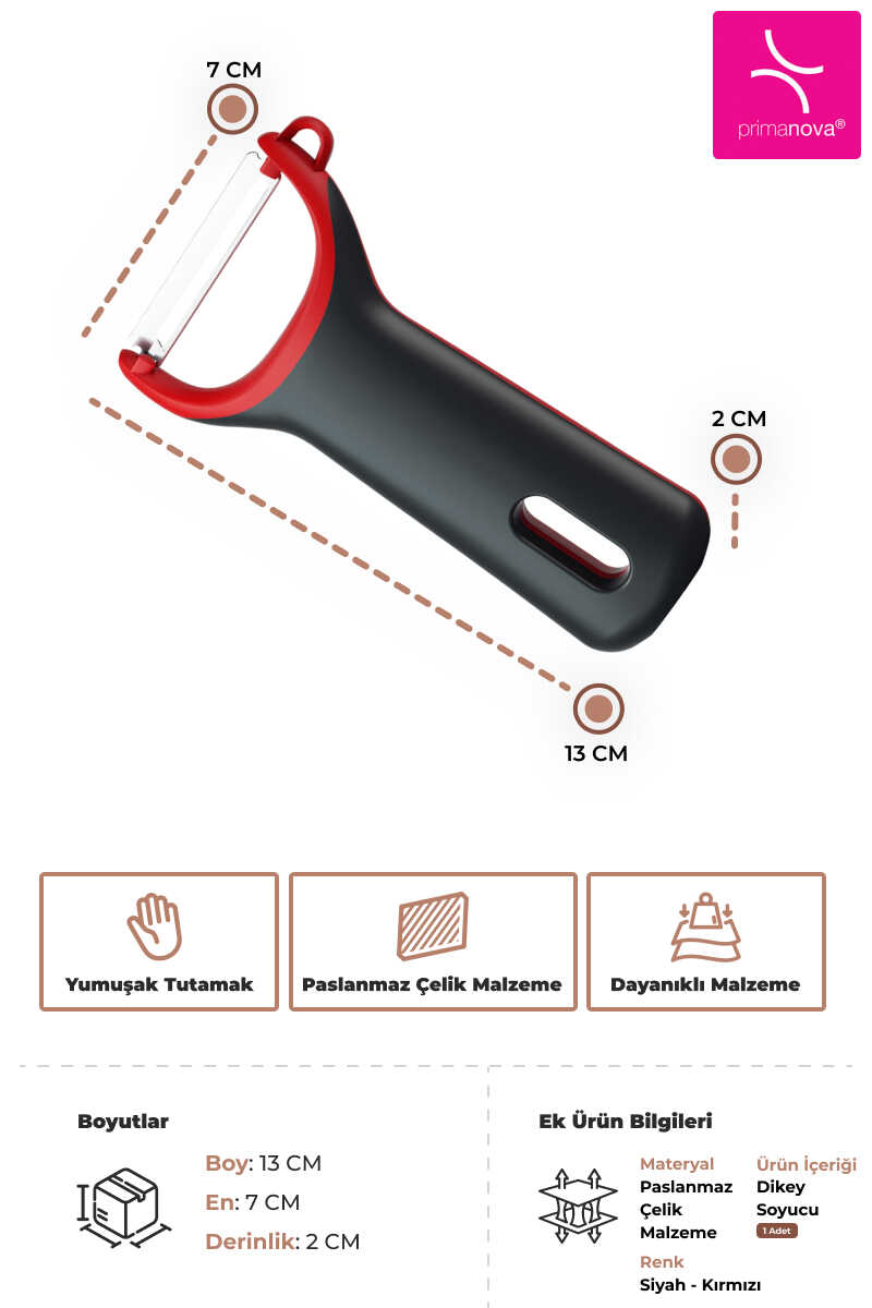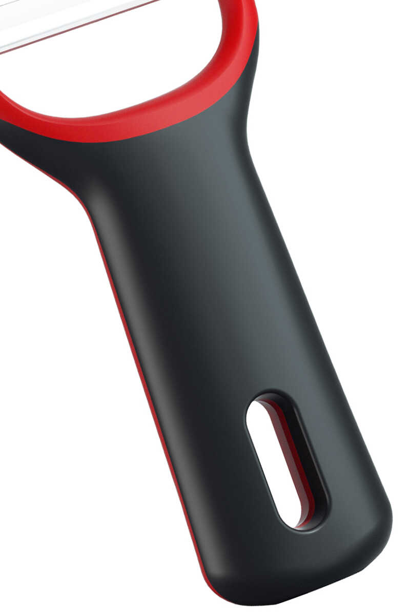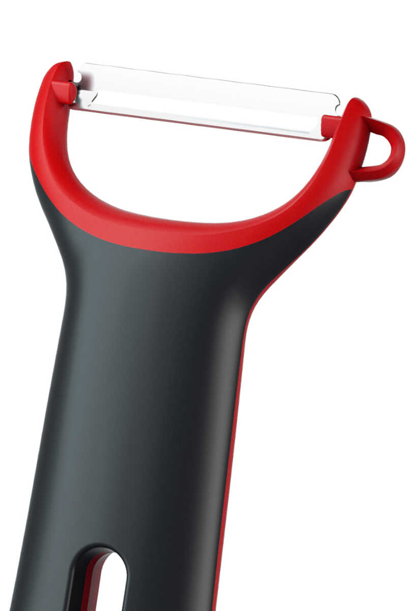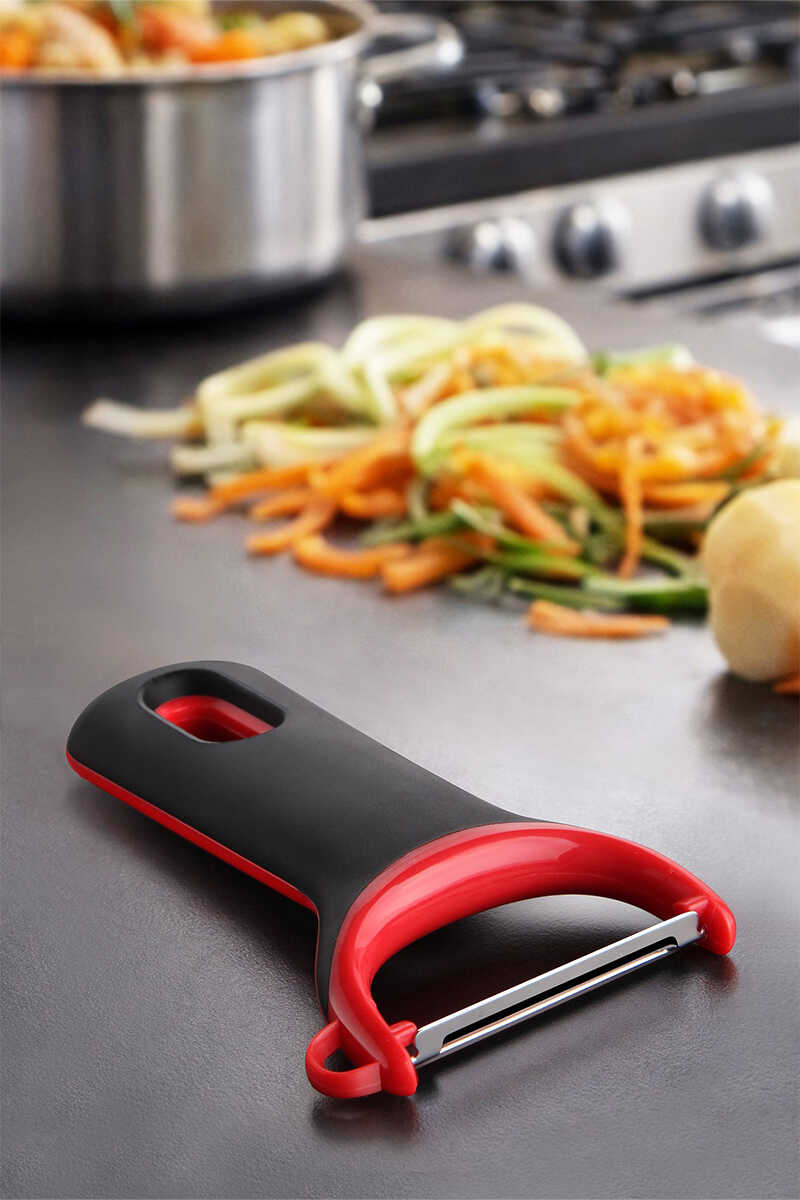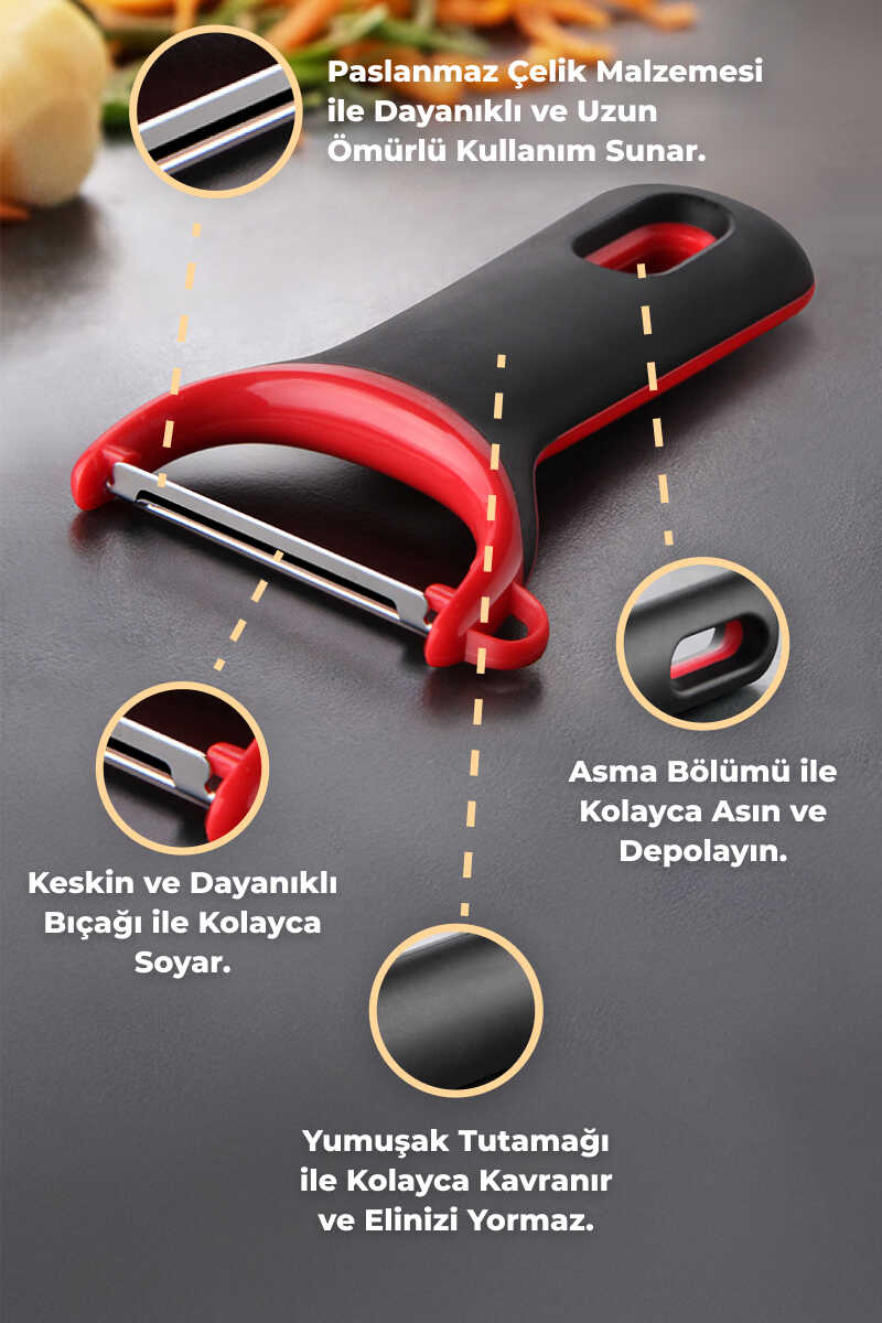 Paslanmaz çelik yapıya sahip dikey soyucu, dayanıklı ve uzun ömürlü kullanım sunar. Yumuşak tutamağı sayesinde kolay kavranır ve eli yormaz.