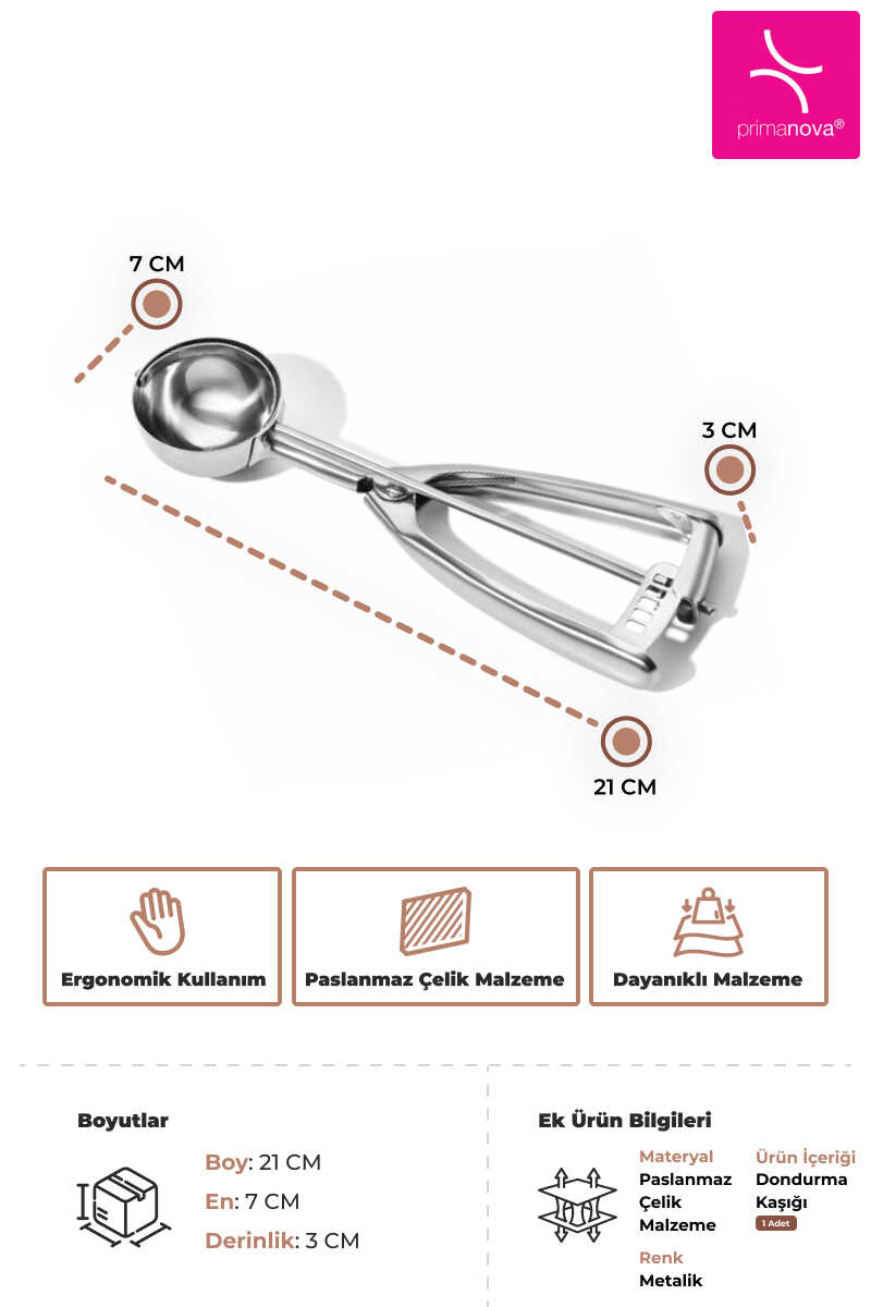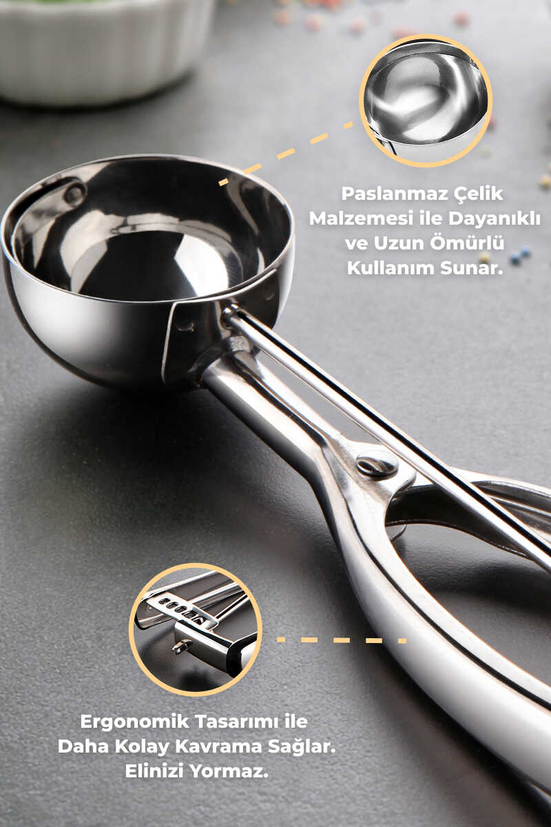 Paslanmaz çelik yapıya sahip Dondurma Kaşığı, dayanıklı ve uzun ömürlü kullanım sunar. Ergonomik tutamakları sayesinde kolay kavranır ve eli yormaz.