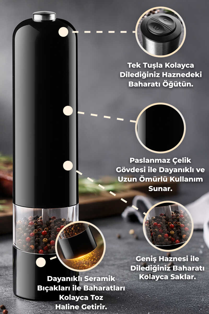 Tek tuş ile haznesindeki baharatı öğüterek servis eder. Işıklı başlık ile içeriği görmenizi sağlar.