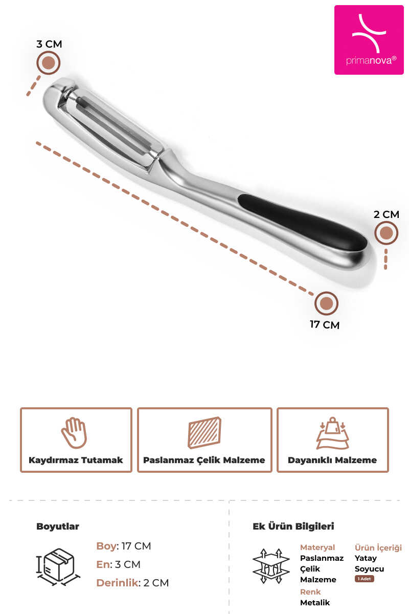 Paslanmaz çelik yapıya sahip Yatay Soyucu, dayanıklı ve uzun ömürlü kullanım sunar. Kaydırmaz tutamağı sayesinde kolay kavranır ve eli yormaz.