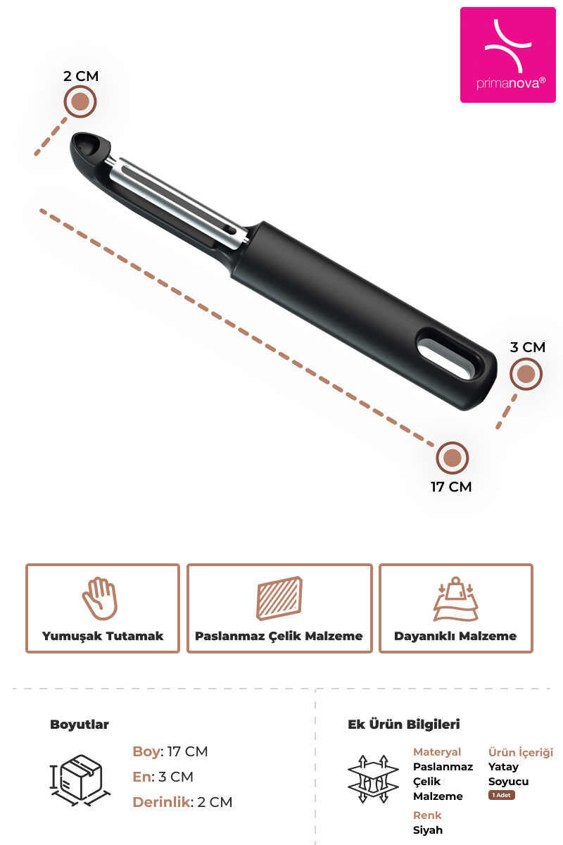 Paslanmaz çelik yapıya sahip yatay soyucu, dayanıklı ve uzun ömürlü kullanım sunar. Yumuşak tutamağı sayesinde kolay kavranır ve eli yormaz.
