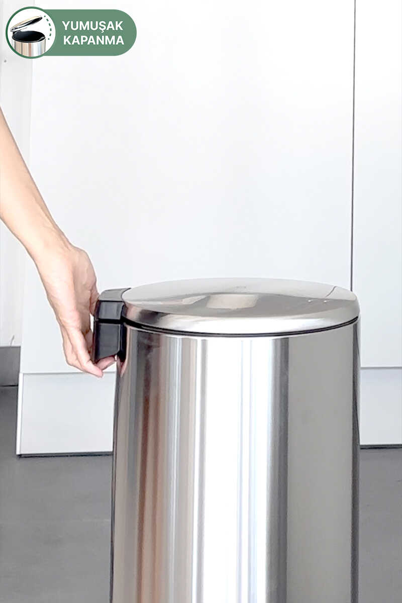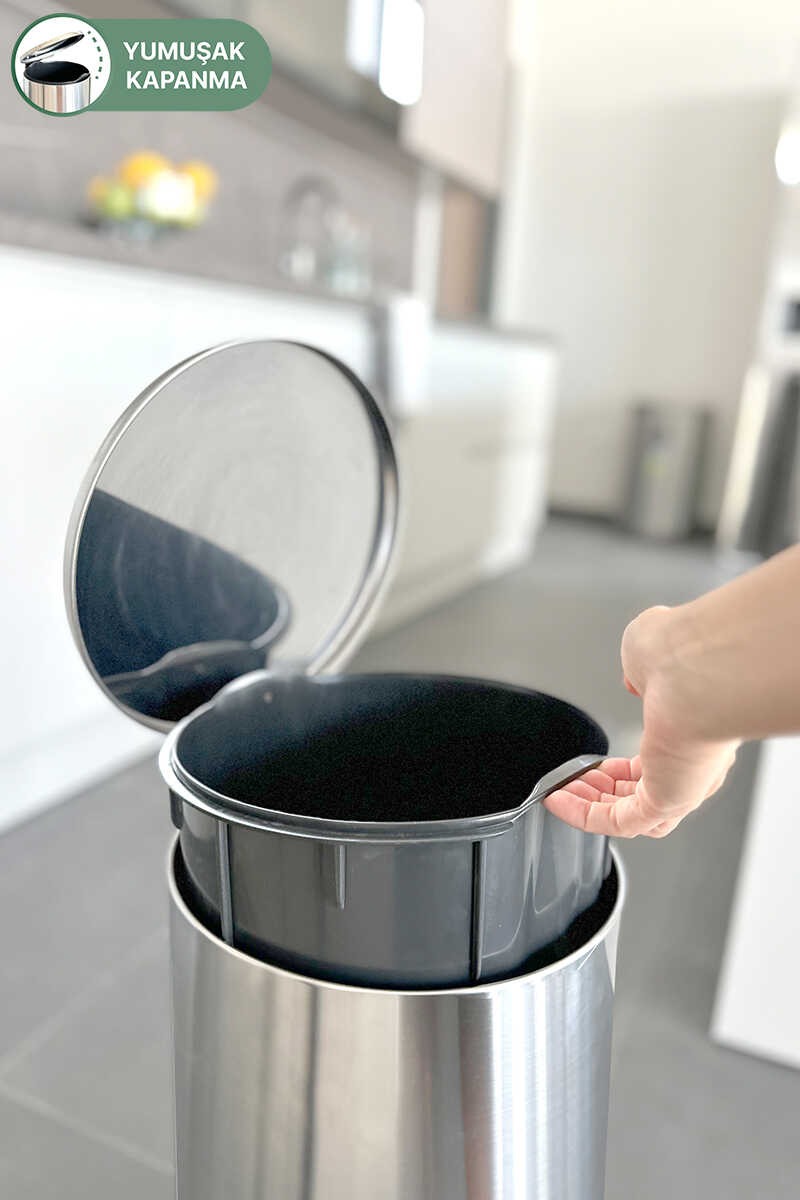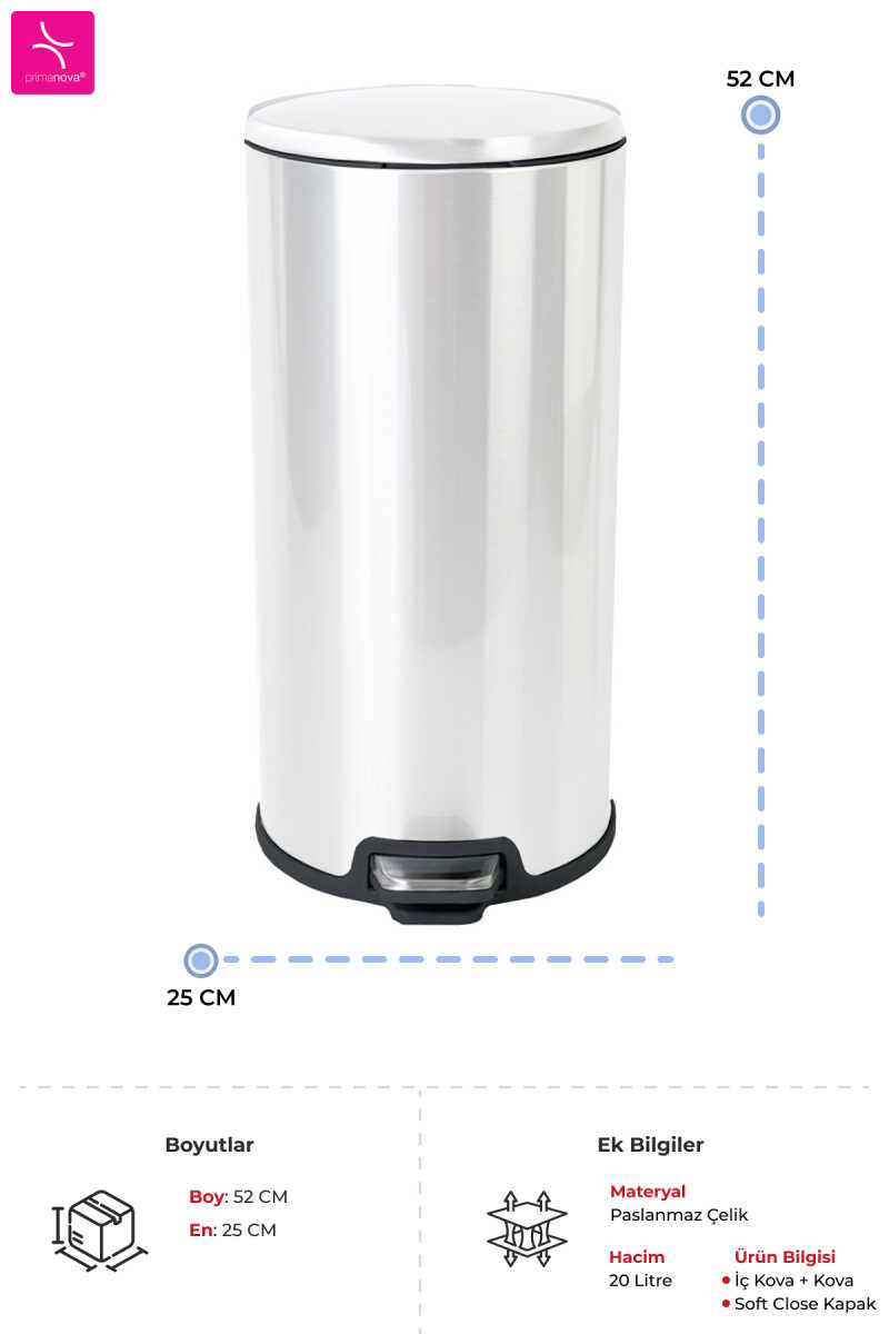 Primanova Cigo Çelik Çöp Kovası 20 LT. * Yavaş / Sessiz kapanan kapak. * Parmak izi bırakmaz. * Çıkarılabilir iç kovası vardır. * Kolay poşet değişimi için kapak açık halde sabitlenebilir. * Ürün ölçüleri 25 x 52 CM * Plastik/metal yüzeyleri temizlemek için sert sünger veya tel fırça kullanmayınız. Temizlikten sonra ürünü ıslak bırakmayınız. * Geliştirilmiş sağlam pedal sistemine sahiptir.