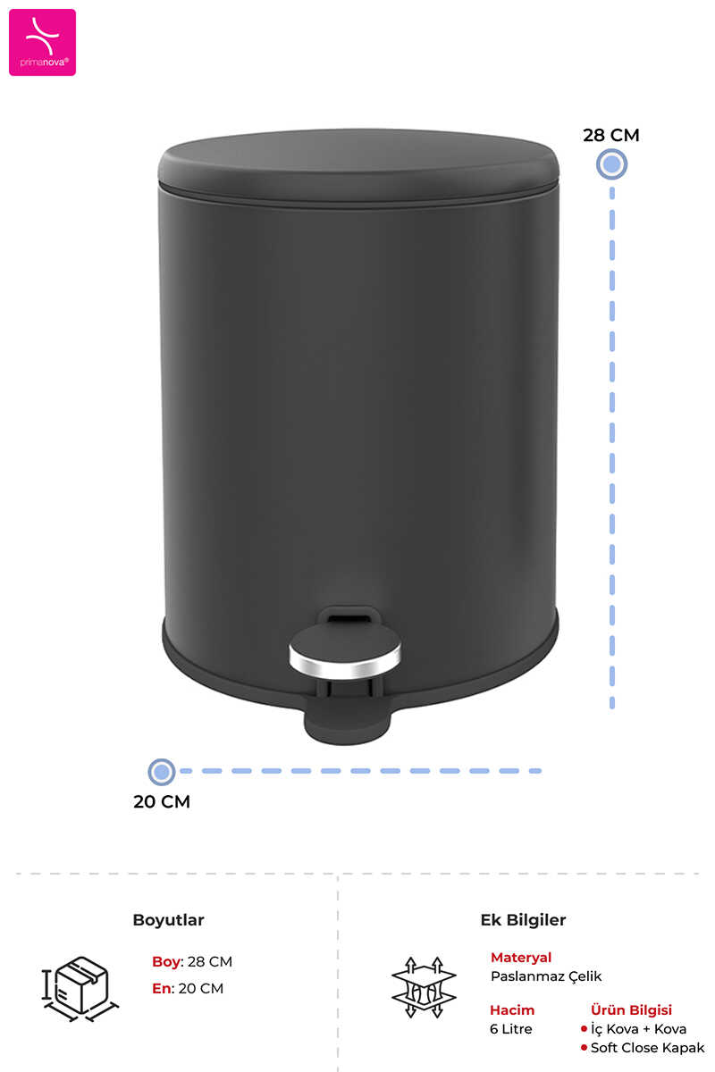 Primanova Cigo Paslanmaz Çelik Çöp Kovası Mat* Daha uzun kullanım süresi için geliştirilmiş mekanizma* Ekstra yumuşak kapanma özelliği* Ürün ölçüleri 20x28 cm SİYAH 6 lt