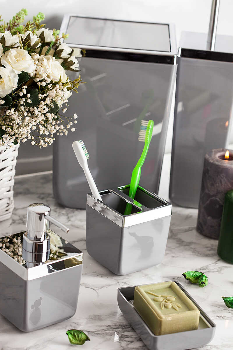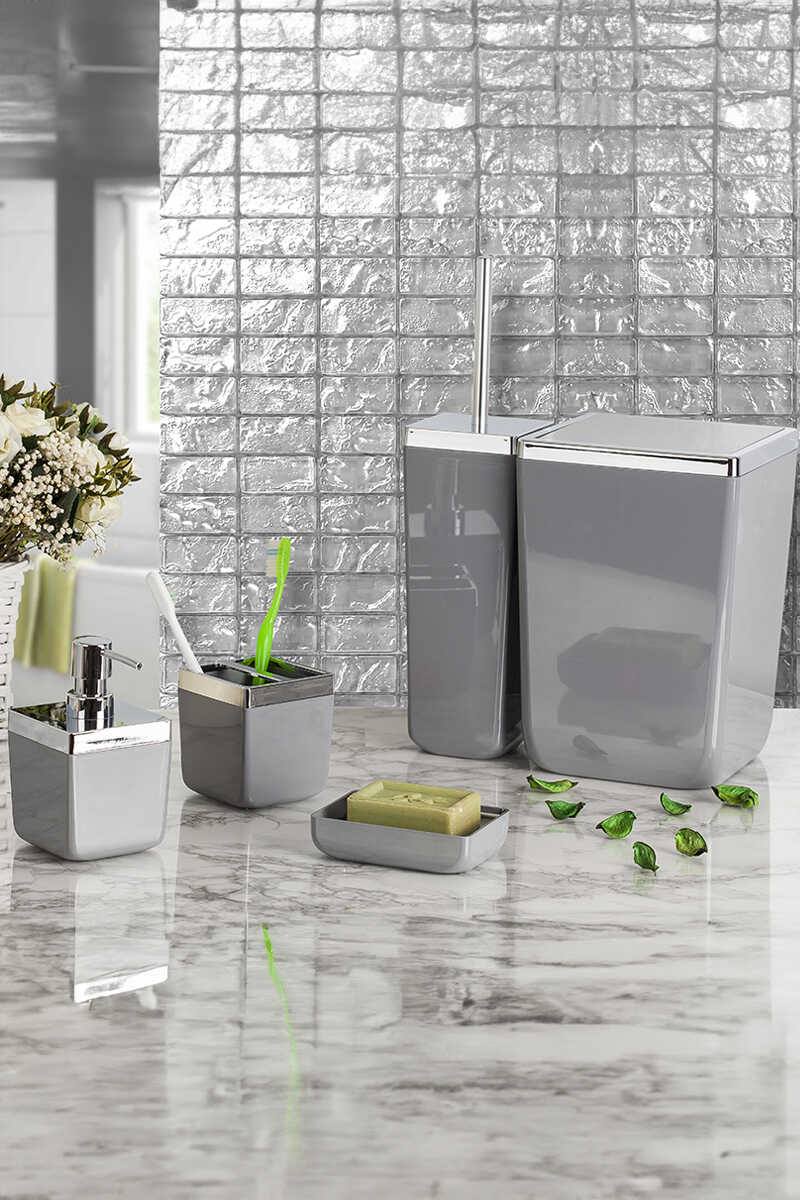 Primanova Toskana Banyo Seti 5 parçadan oluşup sıvı sabunluk, 10x8,5x15,5 cm 440 ml sabunluk, 8,5x11,5x3 cm diş fırçalık 8,5x8,5x10 cm ,kapaklı kova17,5x17,5x26 cm 6 lt ve tuvalet fırçası 8,5x8,5x38 cm bulunmaktadır.*Parlak ve krom kaplamalı plastik kombinasyonu.