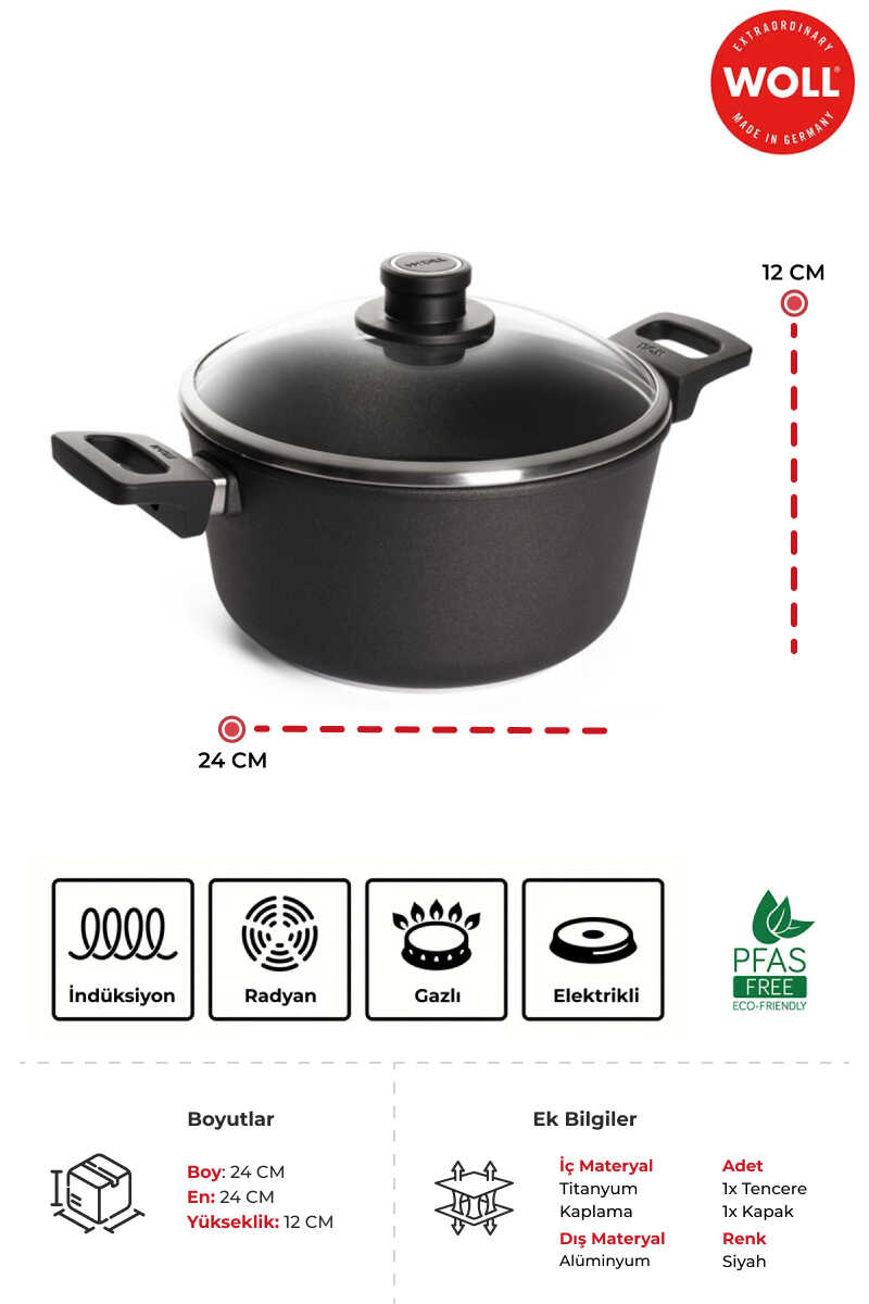 Woll titanyum kaplama derin tencere 24 CM Pratik - Kolay saklama - Kolay temizleme - Güvenli 40 yıl önce bir master şefin mükemmel kızartma tavası hayali woll ile gerçekleşti.1979 yılında başlayan serüven devam ediyor. Özel üretim süreci ve pfoa içermeyen kaplama hızlı ısı dağılımı ve ısı koruma çizilme ve aşınmalara dayanıklı 4 katmanlı titanyum bazlı sert kaplama optimal termal emilim için yaklaşık 8mm/03 kalınlıkta termal taban titanium nowo güçlendirilmiş köşeleri sayesinde darbelerden etkilenmez. Tencereler fırında kullanılabilir. Kulplar Max. 250°c kadar dayanıklıdır. Köşe açıları ürün içerisindeki sıvı malzemelerden kolay dökülmesini sağlar. Bulaşık makinesinde yıkanabilir. Yüksek sıcaklıkta deformasyon oluşmaz. *indüksiyon versiyonunda uçtan uca paslanmaz çelik taban *indüksiyon versiyonda 10mm/04 kalınlık