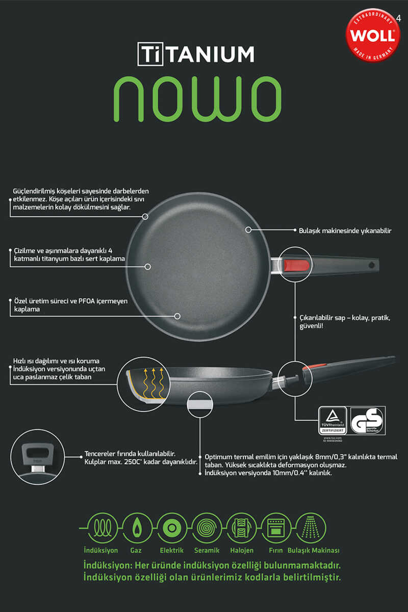 Woll titanyum kaplı sığ tencere 32 CM PRATİK - KOLAY SAKLAMA - KOLAY TEMİZLEME - GÜVENLİ 40 Yıl önce bir master şefin mükemmel kızartma tavası hayali WOLL ile gerçekleşti.1979 yılında başlayan serüven devam ediyor Özel üretim süreci ve PFOA içermeyen kaplama Hızlı ısı dağılımı ve ısı koruma Çizilme ve aşınmalara dayanıklı 4 katmanlı titanyum bazlı sert kaplama Optimal termal emilim için yaklaşık 8mm/03" kalınlıkta termal taban Titanium Nowo Güçlendirilmiş köşeleri sayesinde darbelerden etkilenmez.Tencereler fırında kullanılabilir Kulplar Max. 250°C kadar dayanıklıdırKöşe açıları ürün içerisindeki sıvı malzemelerden kolay dökülmesini sağlarBulaşık makinesinde yıkanabilir.Yüksek sıcaklıkta deformasyon oluşmaz.